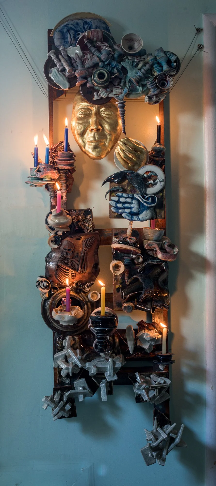 pit-fired stoneware, oil paint, wood, found objects (discarded from personal electronic repairs)